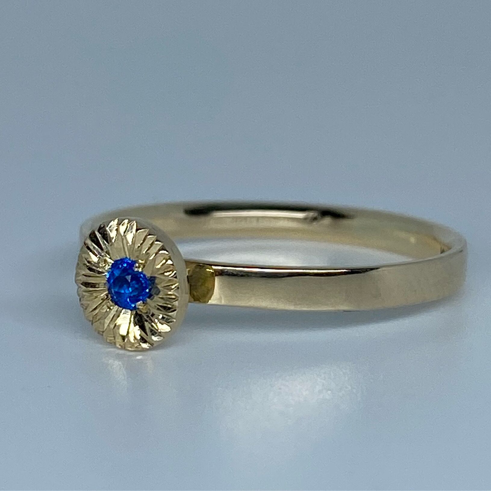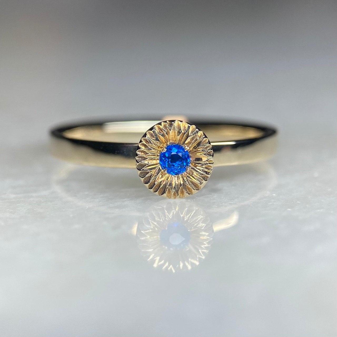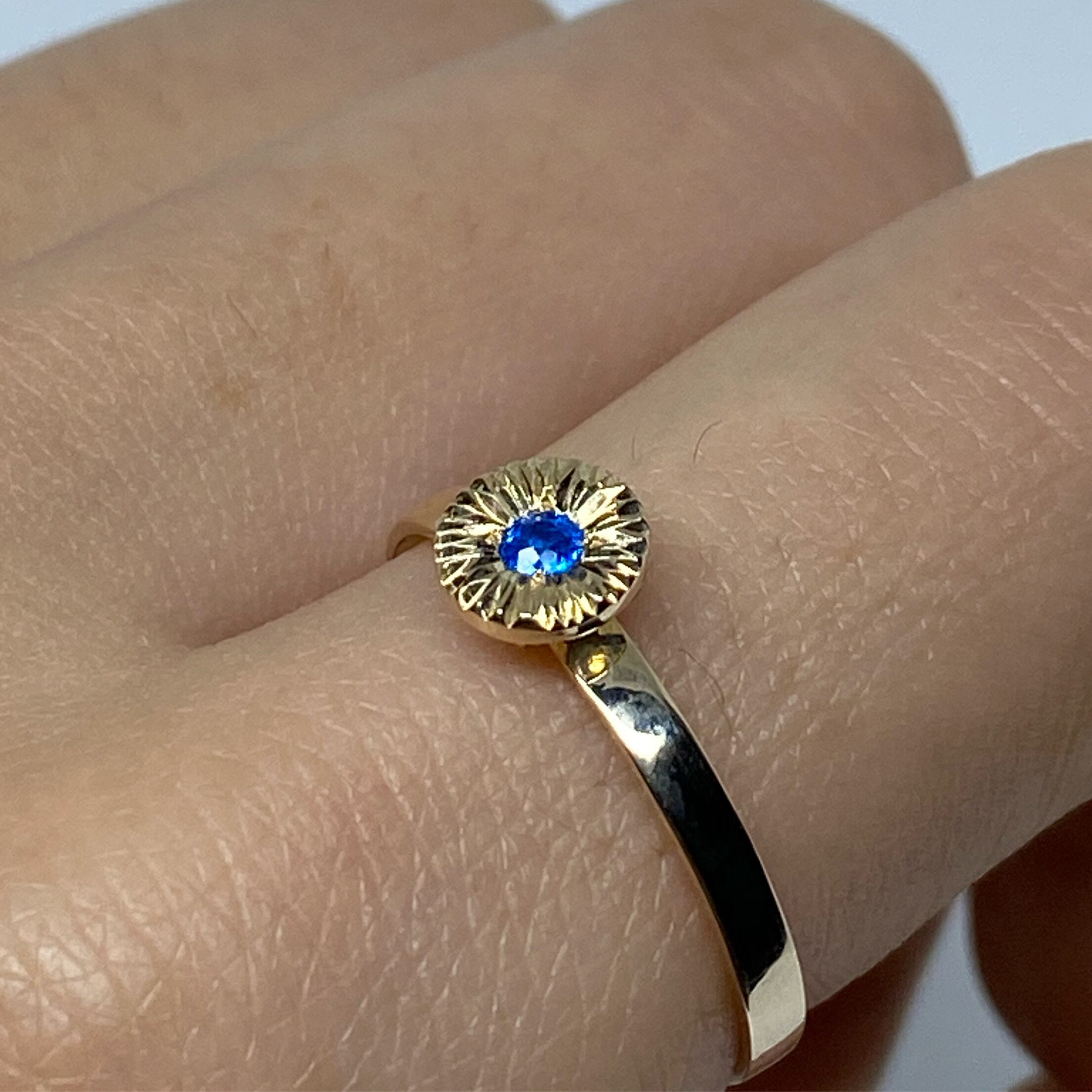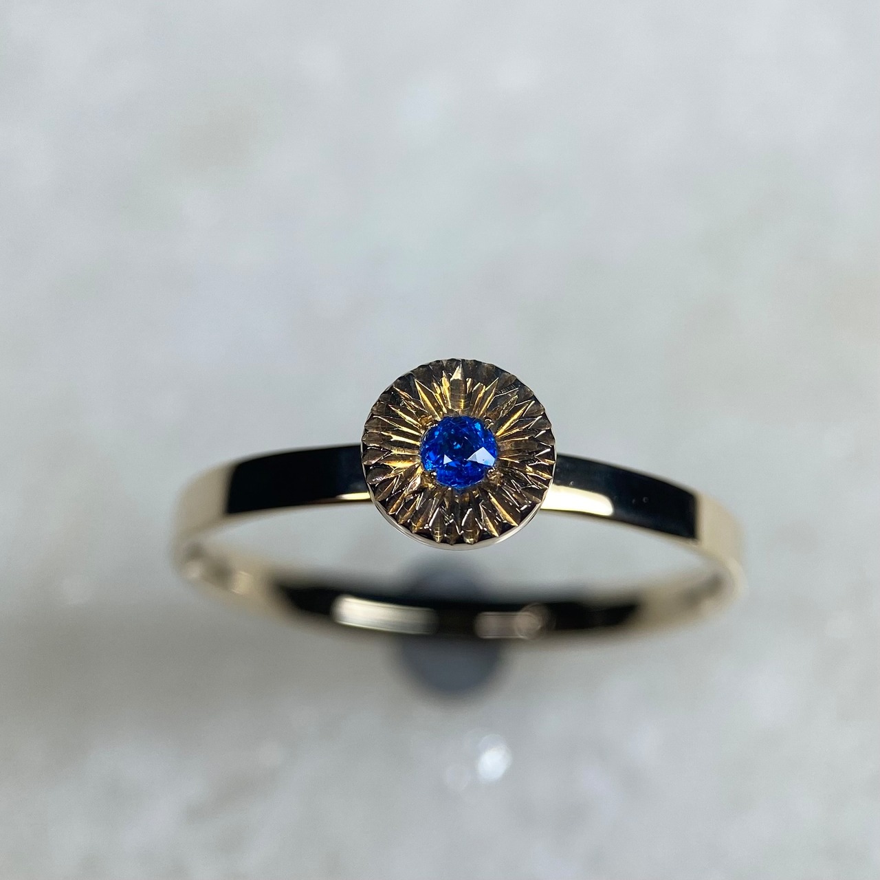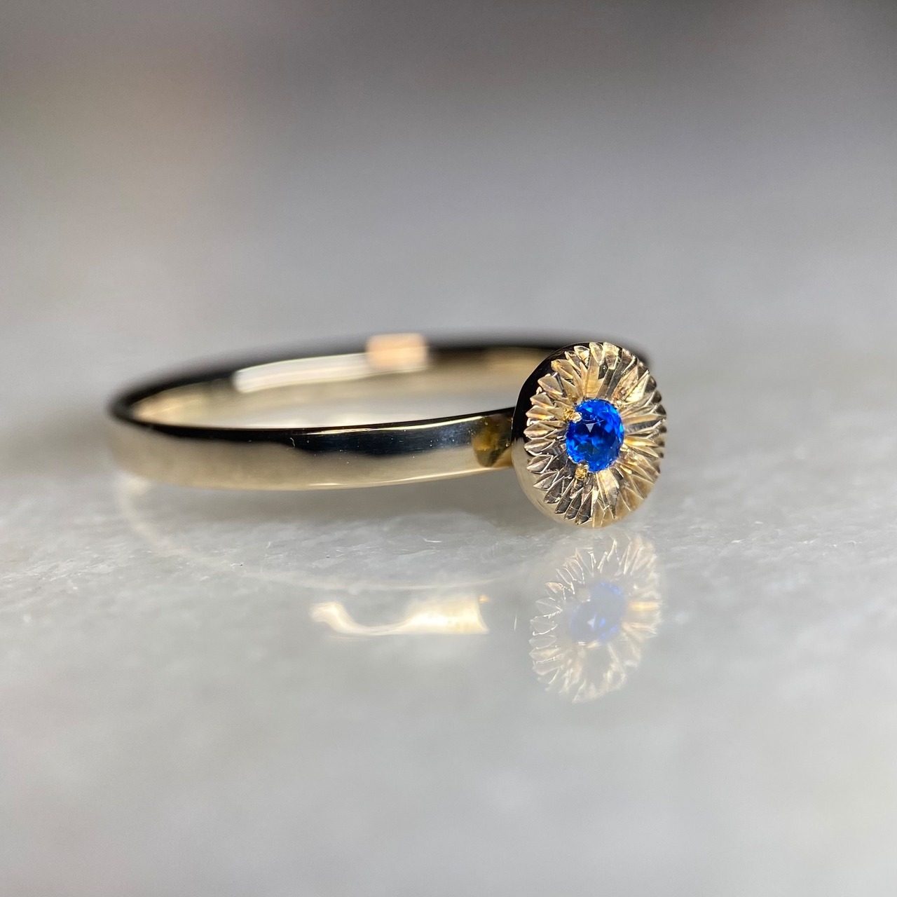 後光留めで石を留め、周りを毛彫でたんぽぽの花びらを表現しました