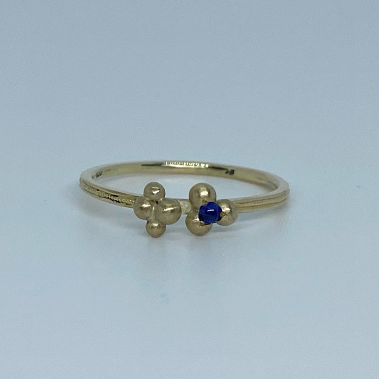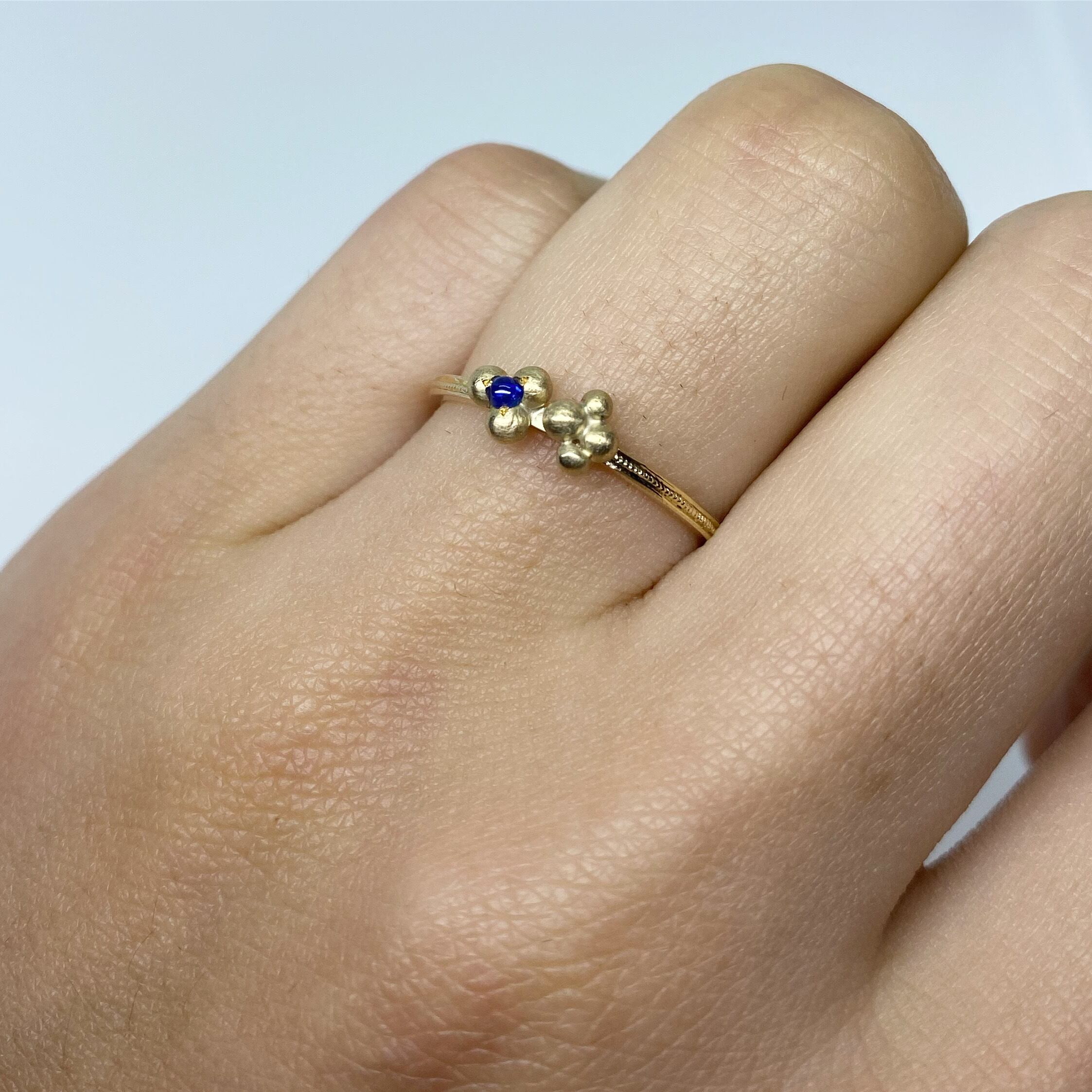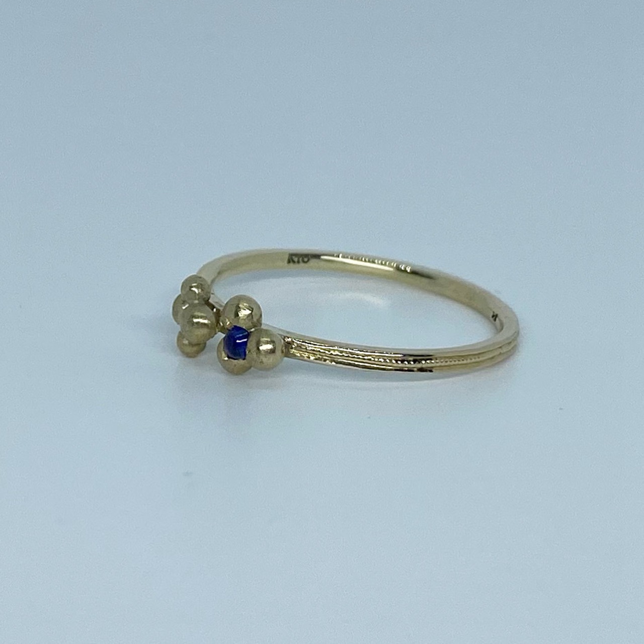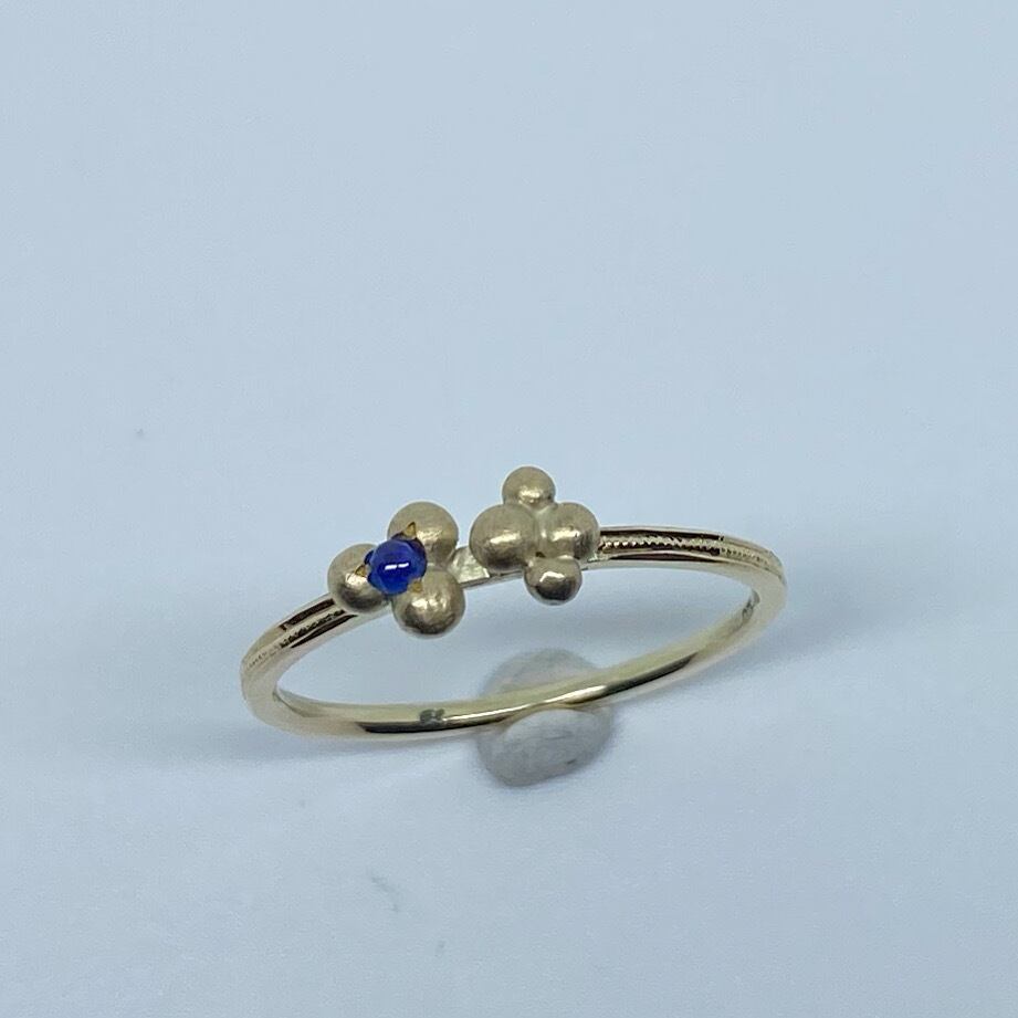 雨粒のような小さな粒をランダムにロウ付して、小さなサファイアカボションを留めました