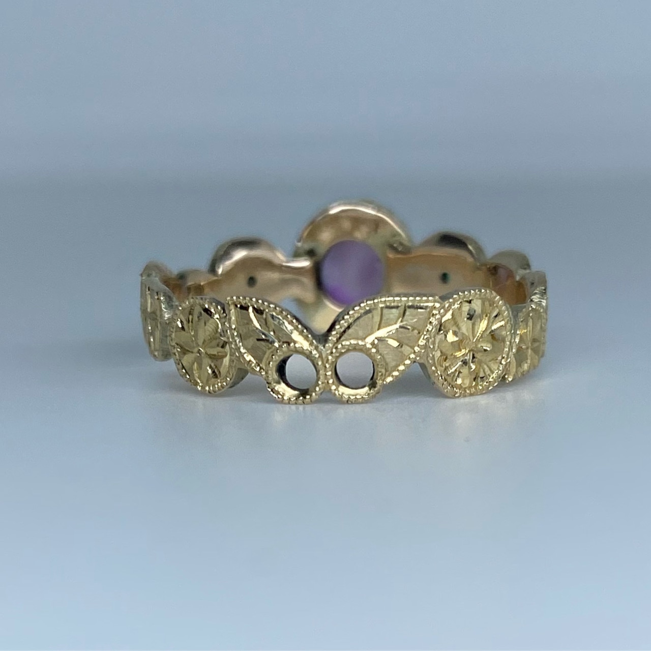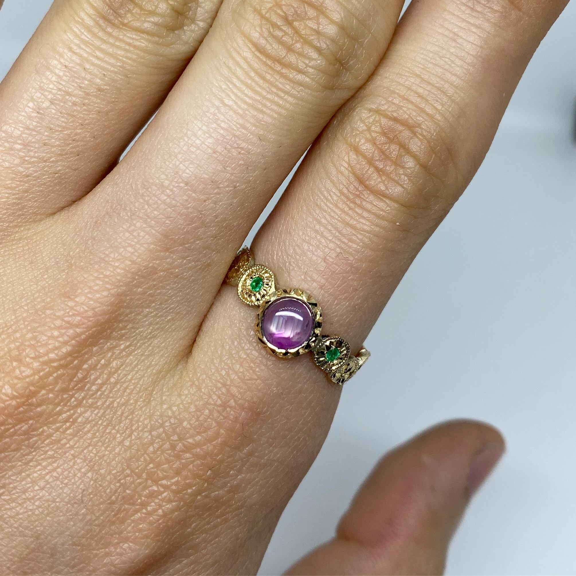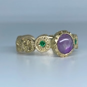 k10リング K10 イエローゴールド 一点もの キラキラ 彫り 和彫り ミル ミル打ち 奏でる 奏 蝶 花畑 樹木 スターサファイア サファイア エメラルド 天然石 一点物