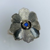 花びらに一つ一つ手彫り、手打ちを施した指輪になります