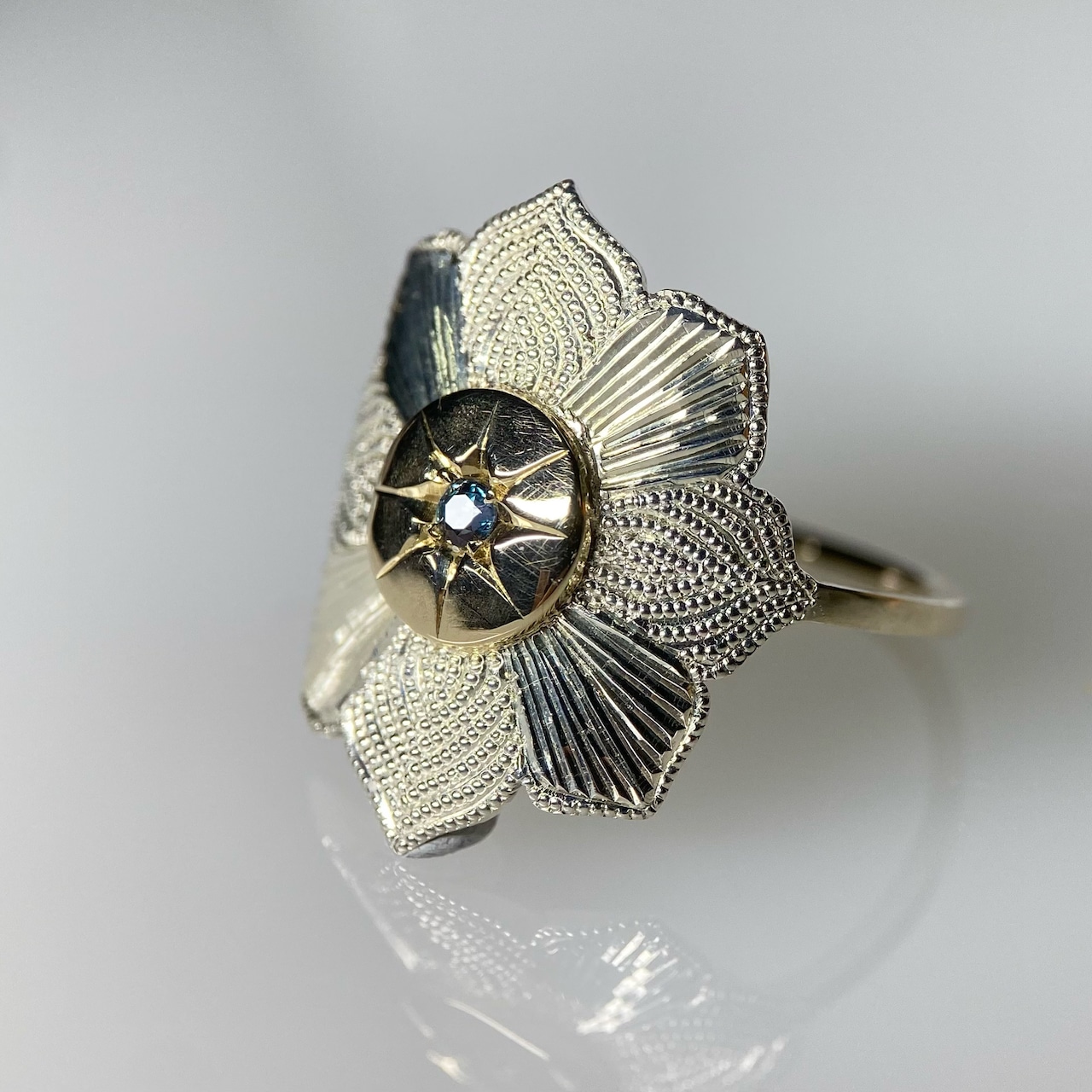 花びらに一つ一つ手彫り、手打ちを施した指輪になります
